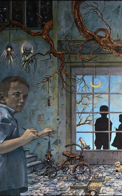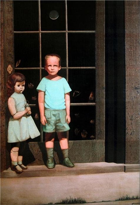 Visų pirma, mergaitė, menininko interpretacijoje, buvo paversta negyva lėle su išlenktomis rankomis ir kojomis. Berniukas pavaizduotas su labai keista išraiška, o šaltas, tiesus jo tamsių akių žvilgsnis, regis, persmelkia kiekvieno, žiūrinčio į paveikslą, sielą. Atidžiau įsižiūrėjus, galima pastebėti baugiausią paveikslo detalę: rankas, įspaustas ant stiklo nugarėlės tiesiai už berniuko ir lėlės-mergaitės. Visos šios detalės, kartu paėmus, sukuria slegiantį įspūdį.
