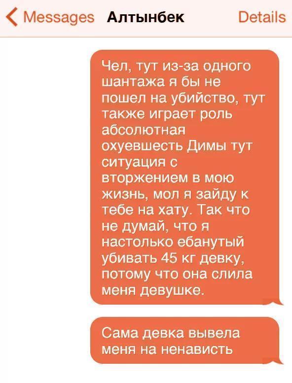 00:33 val. Rizuanas pasmaugė Janą Altynbeko akivaizdoje. Tada jie nuvežė auką 30 kilometrų iš Atyrau į Taldykolo kaimą ir įmetė į Uralo upę. 4 val. Rizuanas ir Altynbekas atvyko į barą ir gėrė viskį bei alų iki 5 val. Grįžę namo, jaunuoliai toliau rašė žinutes. „Eik miegoti, pyragėli“, – rašė Altynbekas.